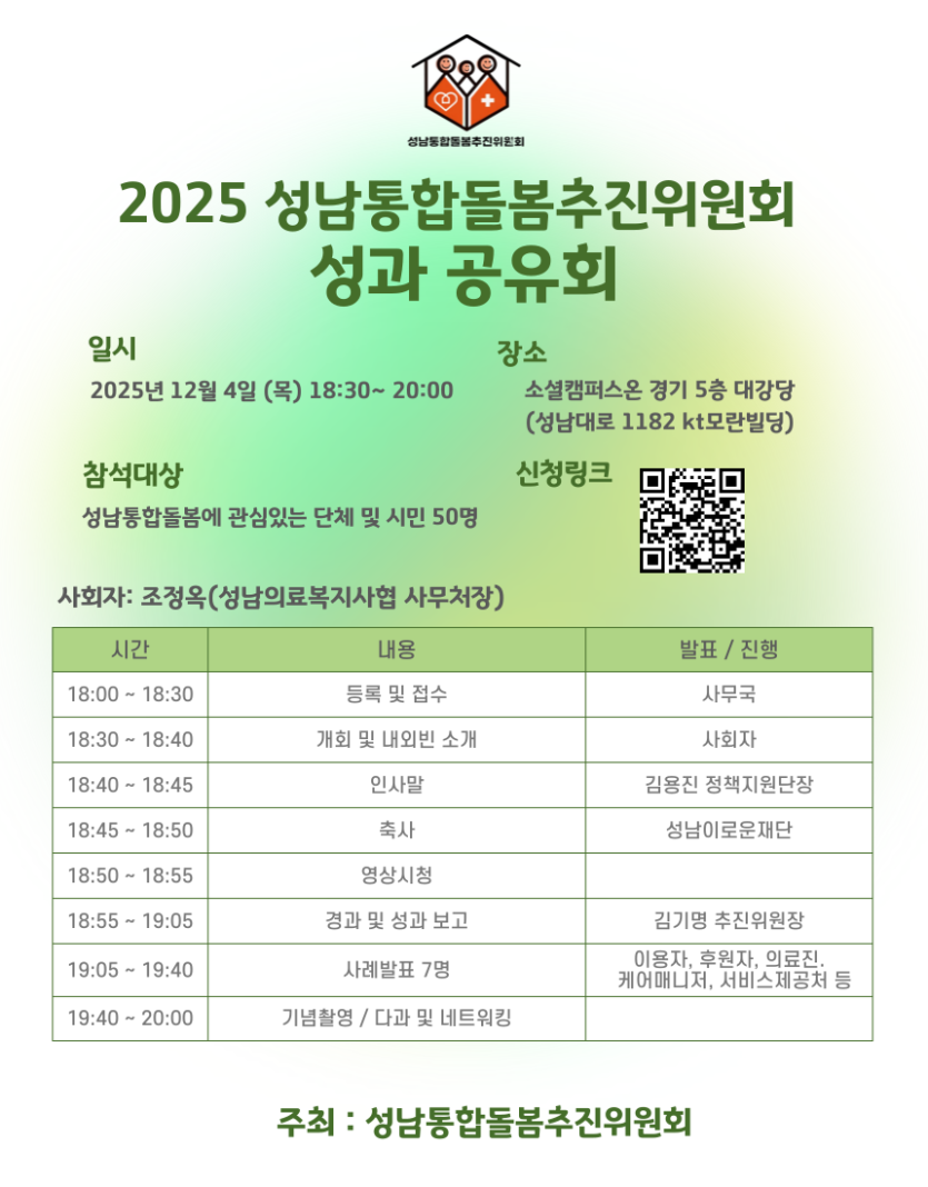 2025 성남통합돌봄추진위원회 성과공유회 안내 페이지 정보 작성자 최고관리자 댓글 0건 조회 1회 작성일 25-12-05 15:47 목록 본문 2025 성남통합돌봄추진위원회 성과공유회 안내 다음글성남의료복지사회적협동조합 임시대의원 총회 소집 공고 25.12.05 댓글 0 댓글목록 등록된 댓글이 없습니다.