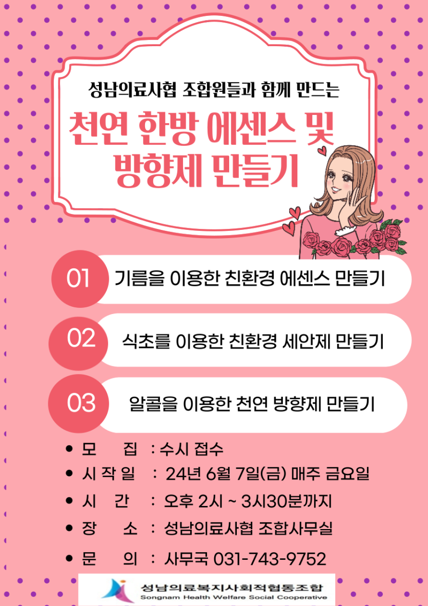 공지사항 천연 한방 에센스 및 방향제 만들기 많은 참여바랍니다. 페이지 정보 작성자 최고관리자 댓글 0건 조회 1회 작성일 25-12-05 15:40 목록 본문 천연 한방 에센스 및 방향제 만들기 많은 참여바랍니다. 이전글성남의료복지사회적협동조합 사회적기업 인증서 25.12.05 다음글4월 건강강좌 많은 관심 부탁드립니다. 25.12.05 댓글 0 댓글목록 등록된 댓글이 없습니다.